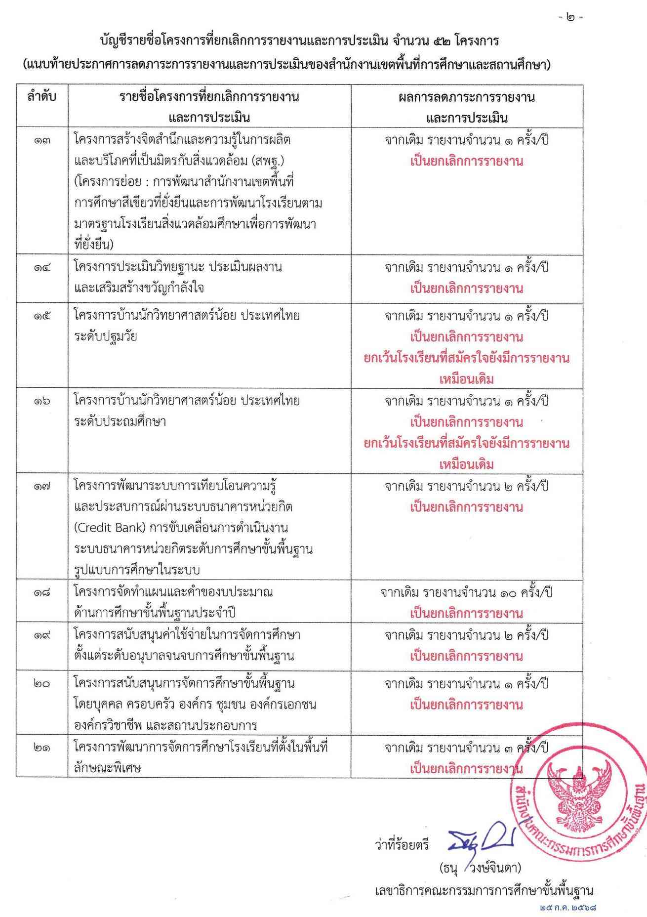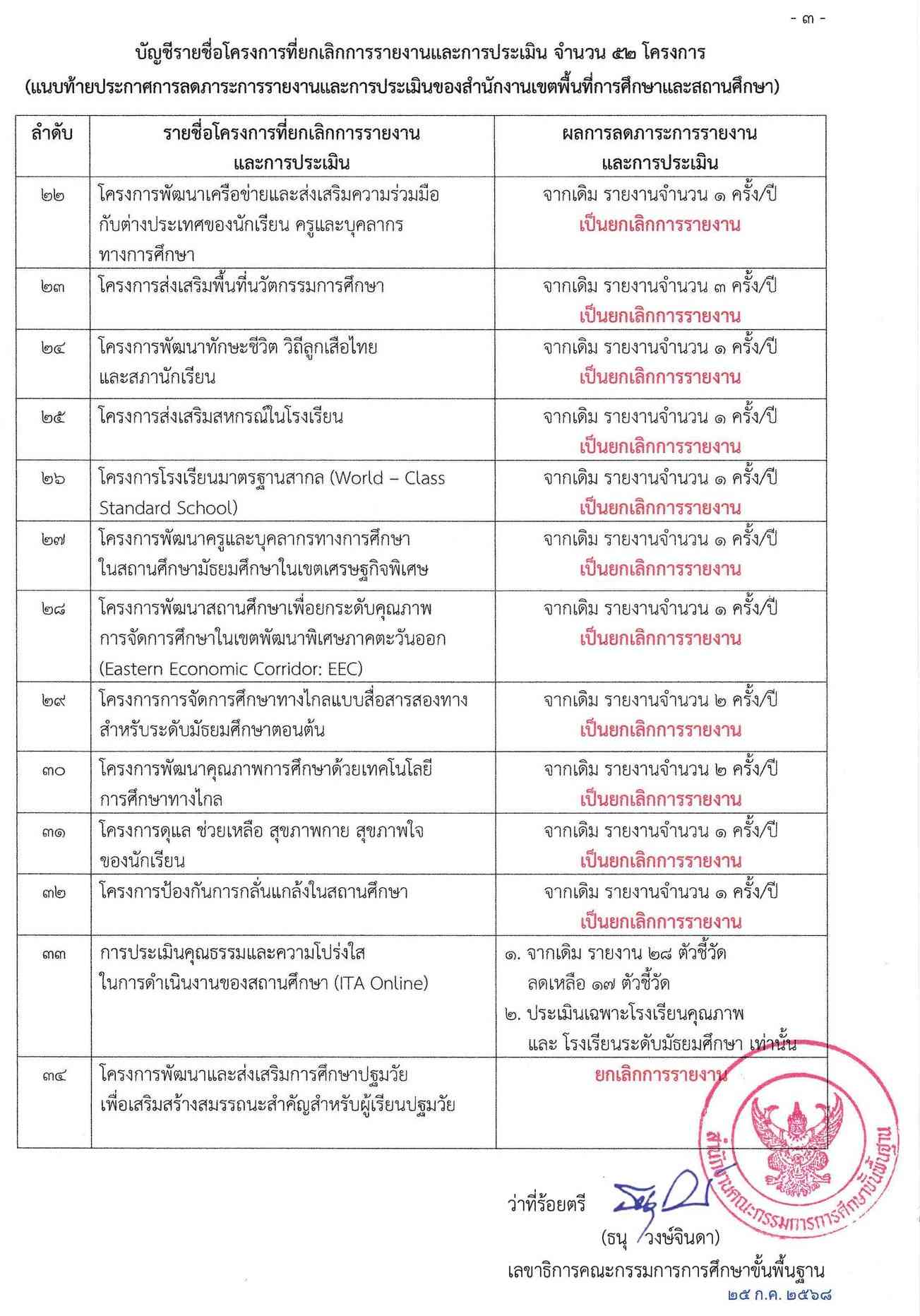 ยกเลิกการรายงาน 52 โครงการ ตามนโยบายลดภาระงานครู เพื่อให้ครูและบุคลากรทางการศึกษาได้มุ่งเน้นการจัดการเรียนการสอนและพัฒนาผู้เรียนได้เต็มศักยภาพ และมีประสิทธิภาพ สอดคล้อง สพฐ. นโยบายเรื่อง ลดภาระการประเมินของสถานศึกษาและปรับลดภาระงานที่ไม่จำเป็นหรือซ้ำซ้อน ประกาศเมื่อ 25 กรกฎาคม 2568
